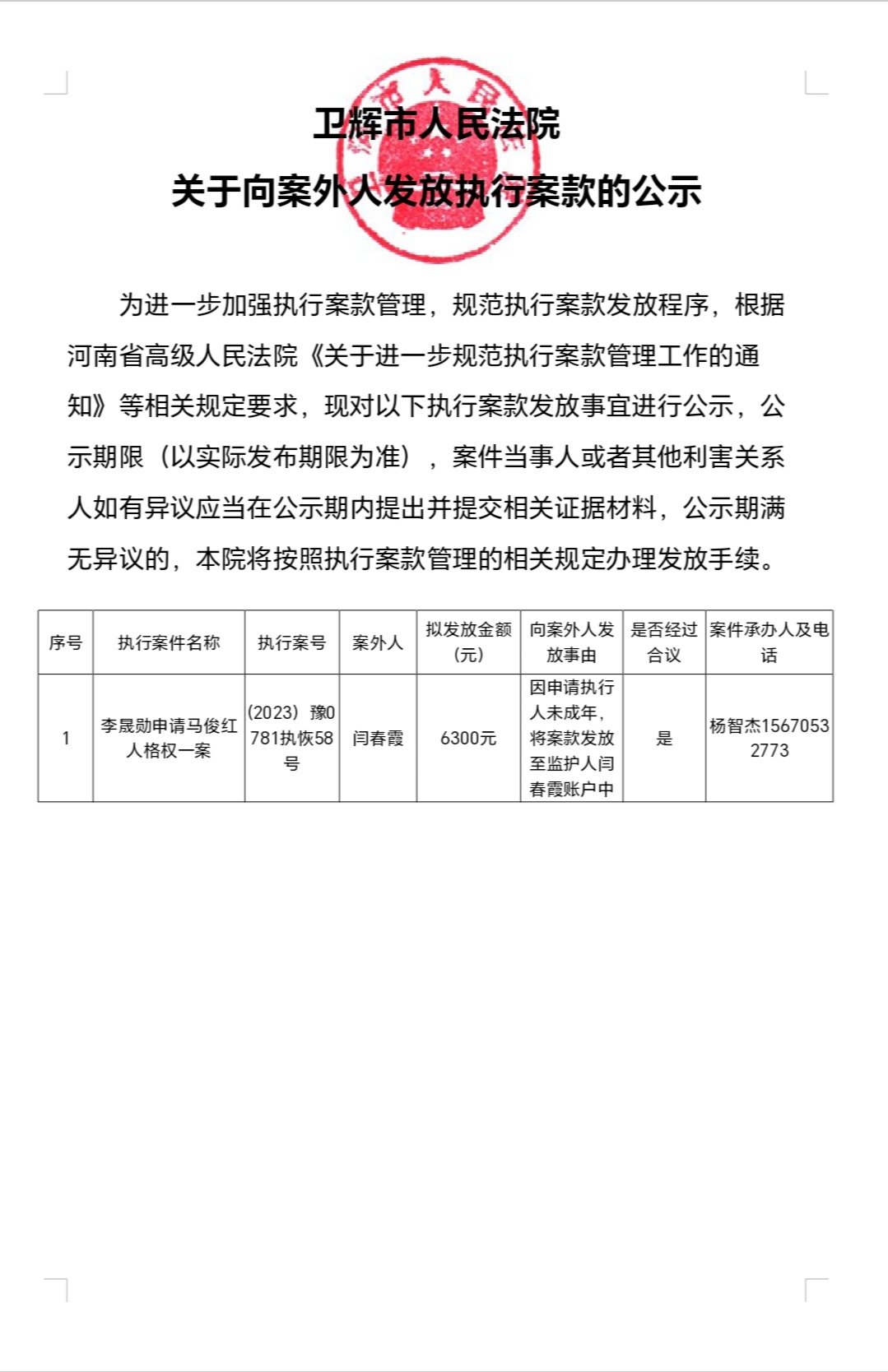 卫辉市人民法院 关于向案外人发放执行案款的公示