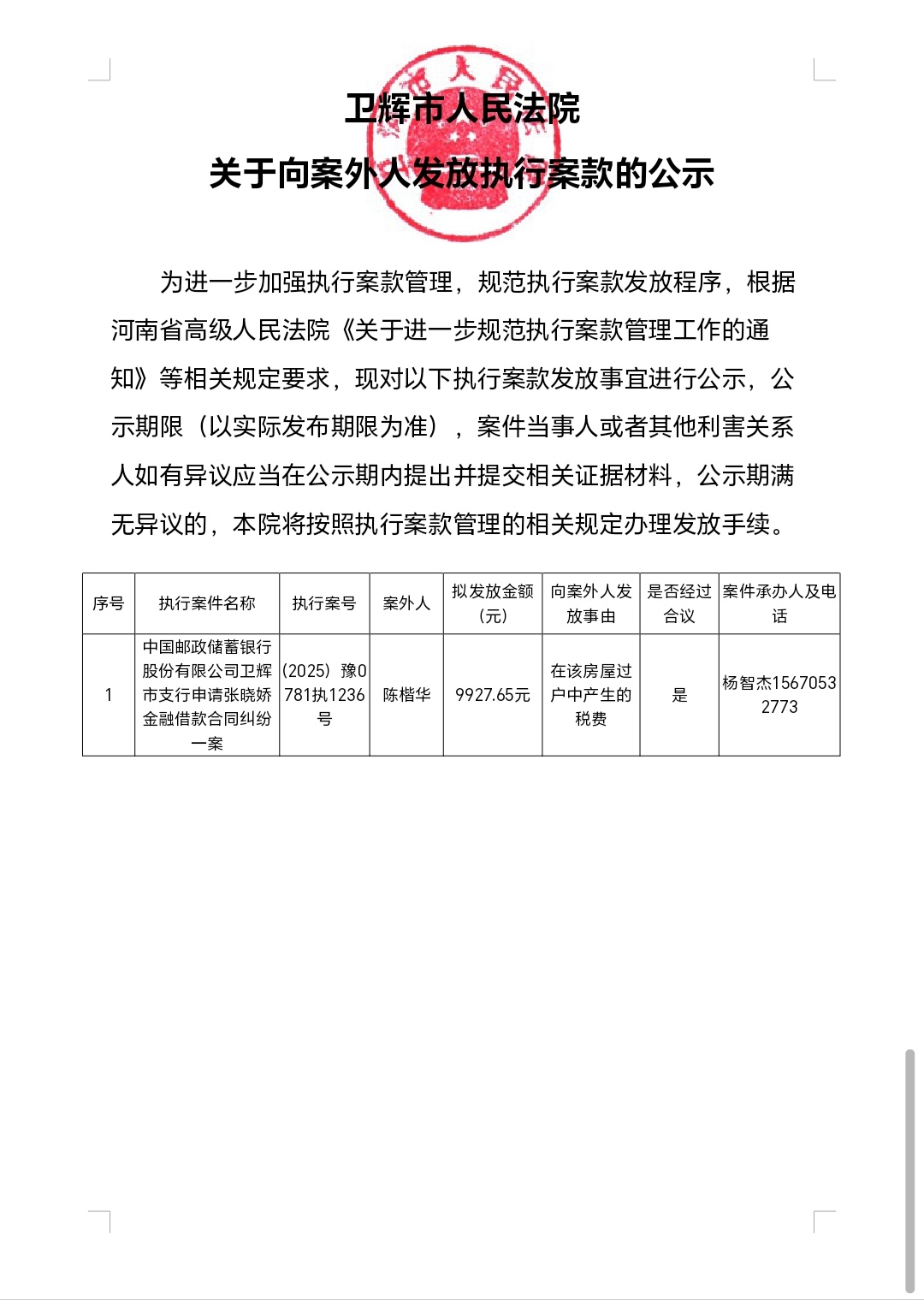 卫辉市人民法院 关于向案外人发放执行案款的公示