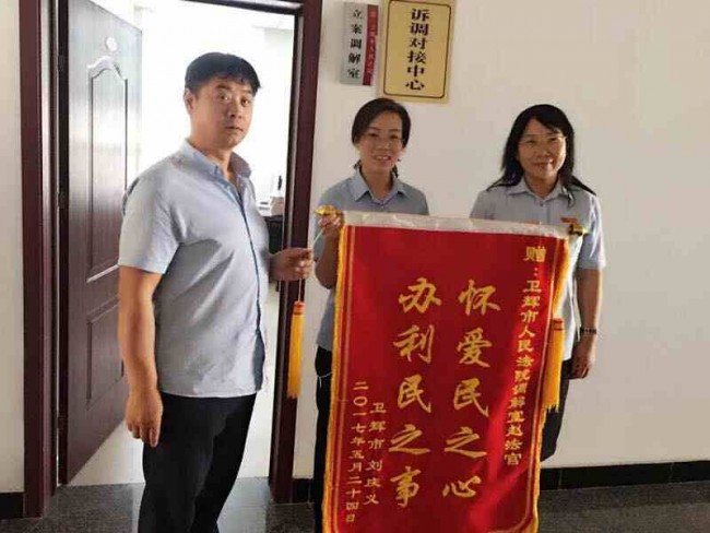 一面“怀爱民之心,办利民之事”的锦旗被刘某送到卫辉市人民法院立案庭调解室法官赵燕荣手中,刘某脸上露出了久违的灿烂笑容。在几个月前刘某还正因货款被拖欠,多次讨要无果而愁眉不展。为保护自己的合法权益,刘某将欠款人张某起诉。立案庭调解室法官赵燕荣在接手案件后,多次耐心与双方沟通、调解,最终原、被告双方达成调解协议,张某如数偿还刘某欠款。至此案件经过调解得到圆满解决,即保障了刘某的合法权益又降低诉讼成本,还能有效节约司法资源。